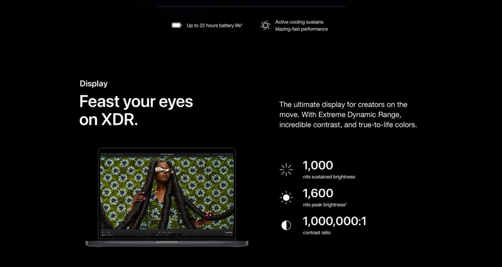 Display | 16.2-inch (diagonal) mini-LED backlit Liquid Retina XDR display, 3456 by 2234 pixels with ProMotion technology for adaptive refresh rates up to 120Hz, and up to 1000 nits sustained (full-screen) brightness, 1600 nits peak brightness, True Tone technology, ProMotion technology for adaptive refresh rates up to 120Hz |