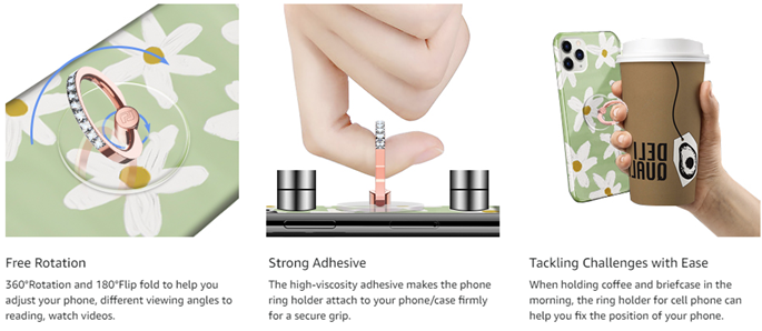 • Strong Adhesive Phone Ring: The high-viscosity adhesive makes the ring holder attach to your phone/case firmly for a secure grip, which greatly reduces the risk of accidentally dropping down.
