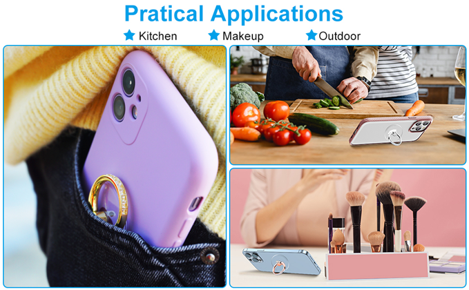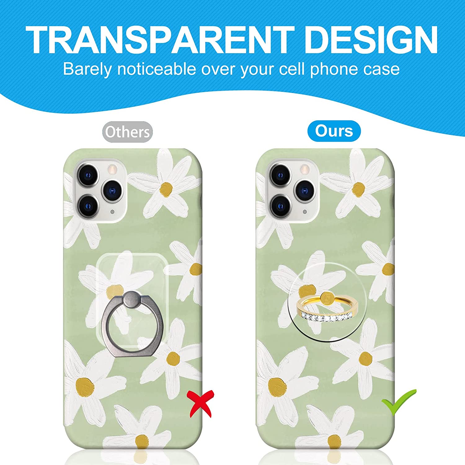 • Transparent Design: The ring holder for cell phone is made of transparent Acrylic, allowing you to keep the unique design of your phone case but also giving you the features of having a phone ring holder.