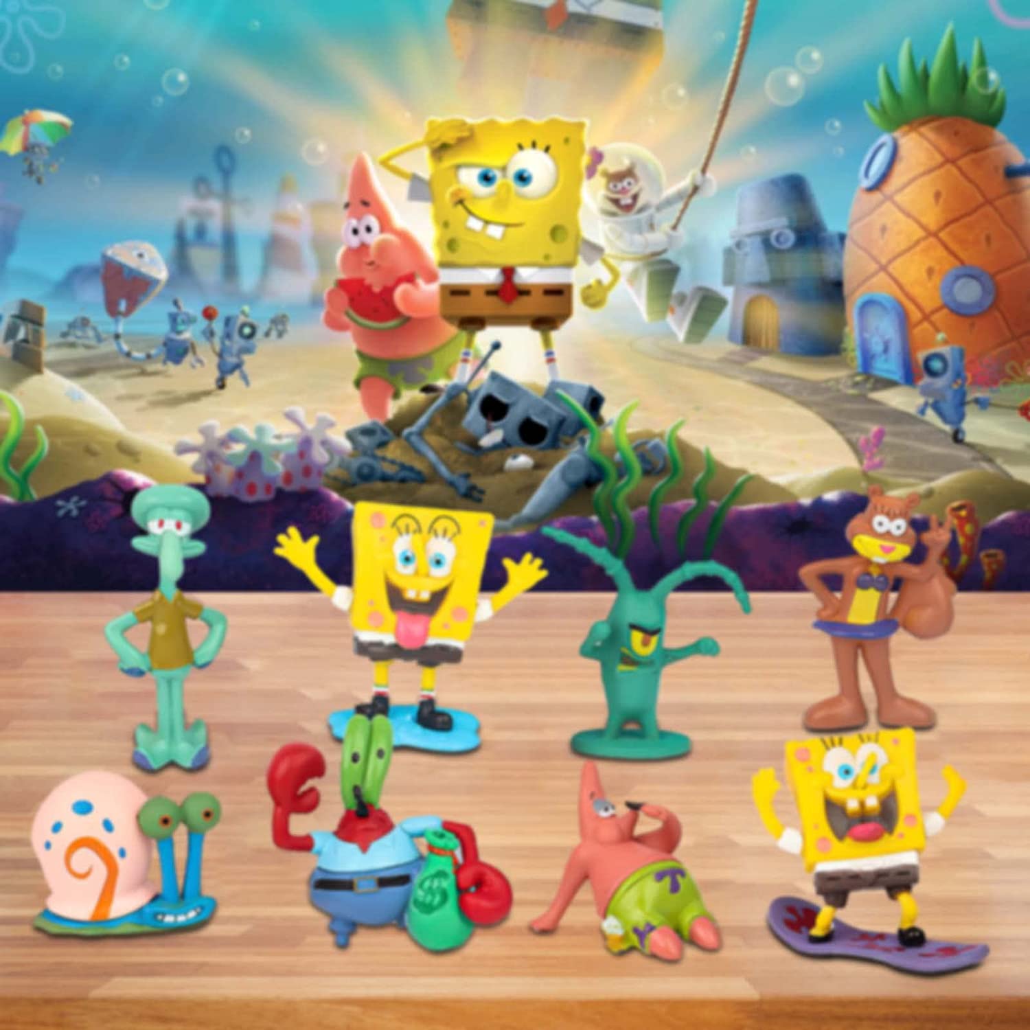 8 piece figurine playset with characters from the hit tv show... Spongebob Squarepants! These are great for cake toppers to decorate a cake, to give as birthday party favors, or to use as toys to play with! These are genuine toys. No retail box or retail packaging. All characters are individually wrapped in clear bags and sealed together in a clear OPP/CPP bag. Toys may have slight imperfections but doesn't affect overall appearance. We will ship in a box to ensure safe delivery! SUPER CUTE!! This Set includes: Spongebob - 2 inches Spondebob (surfing) - 2 inches Patrick Star - 1.5 inches Squidward - 2.5 inches Mr. Krabs - 2.25 inches Sandy Cheeks - 2.25 inches Gary - 1.5 inches Plankton - 2 inches