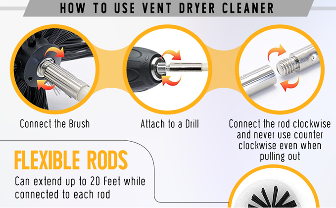 - ATTACH TO A DRILL FOR FASTER CLEANING: Every dryer vent duct cleaning kit comes with a drill attachment so you can take your vent cleaning to the next level. Hook it up to a power drill and have a spot-free vent in minutes.