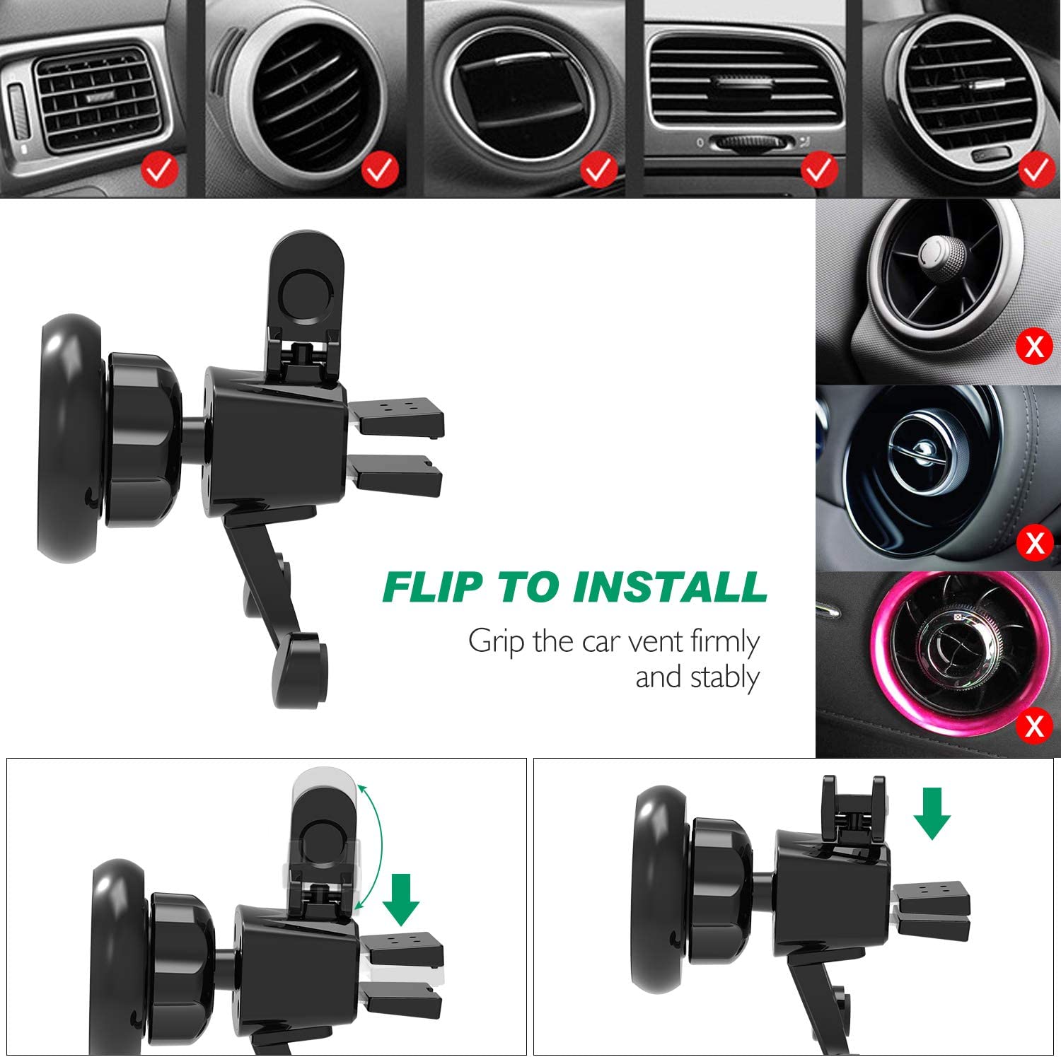 • Easy Install and Operation: Easily flip to install or remove the car phone mount from air vent; within a split second you can take your cell phone with one hand, on and off the magnetic plate of this magnetic cell phone holder.