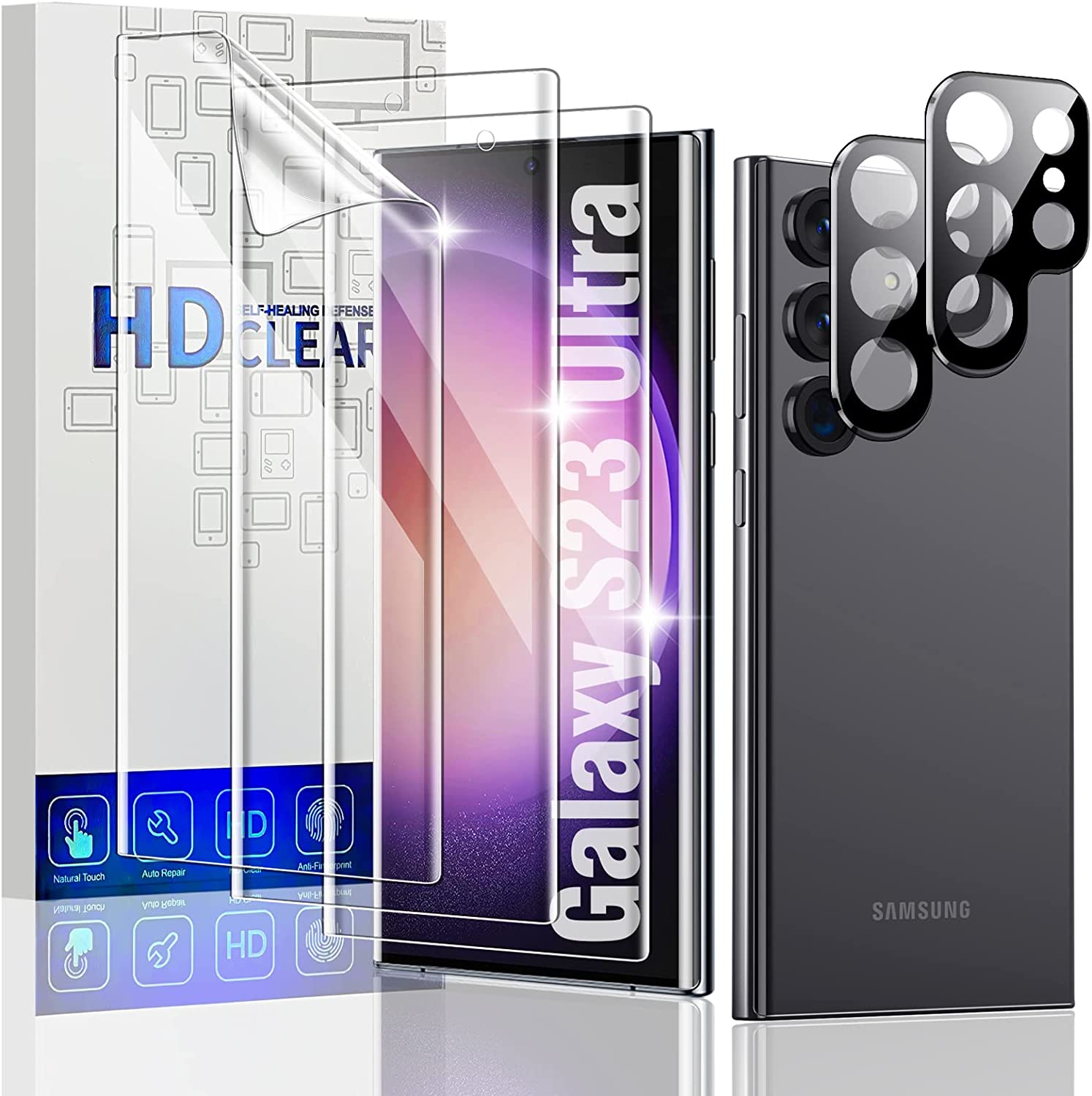 [3+2 Pack] for Galaxy S23 Ultra Screen Protector, 2 Pack Camera Lens Protector [Automatic Bubble Repair] Anti-glare HD Flexible Screen Protector- Fingerprint Quick Unlock for Galaxy S23 Ultra