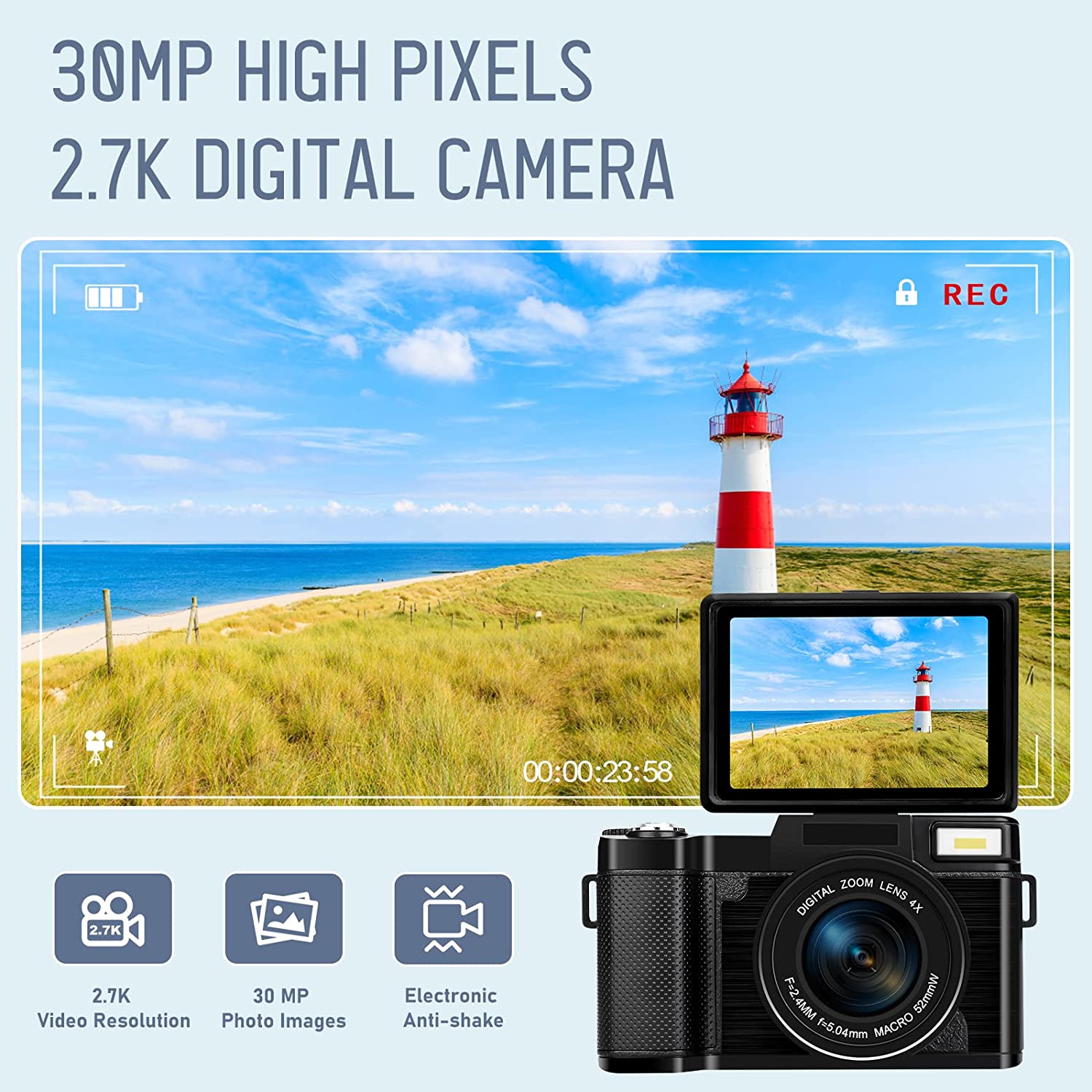 Digital Camera for Photography, 2.7K 30MP Vlogging Camera for YouTube with 32GB SD Card, Portable Digital Video Camera for Begginers,Teens with 3.0 Inch 180 Degree Flip Screen, 2 Batteries