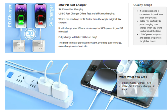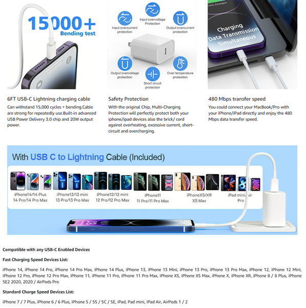 The 20W USB-C port PD fast adapter USB C wall charger and 6ft usb c to lightning cable, which can reach up to 3X faster than the Apple original 5W charger.