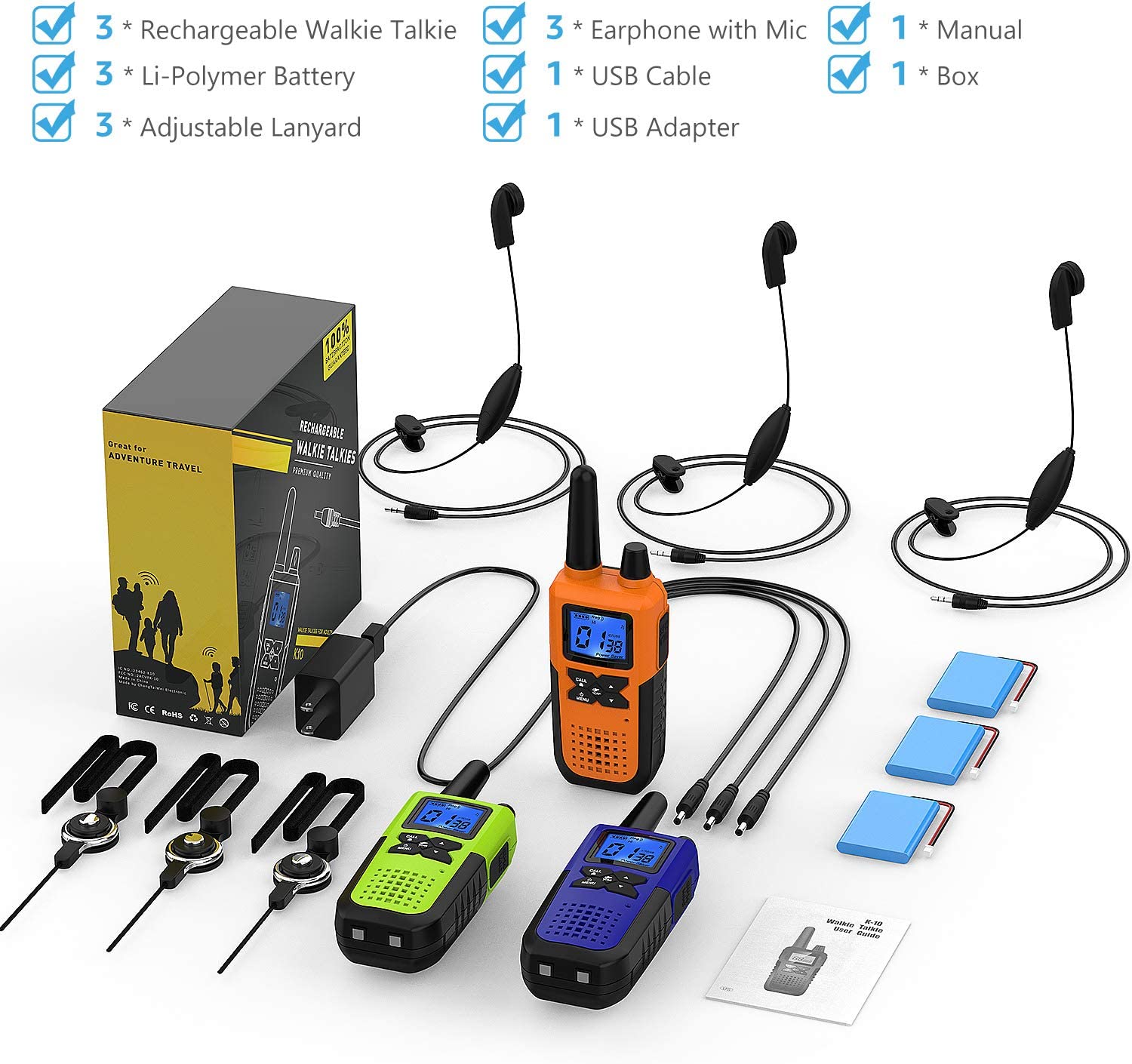 3 Long Range Walkie Talkies Rechargeable for Adults - NOAA 2 Way Radios Walkie Talkies 3 Pack - Long Distance Walkie-Talkies with Earpiece and Mic Set Headsets USB Charger Battery Weather Alert