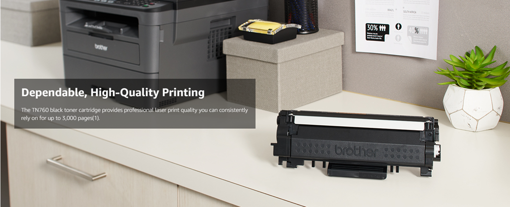 The use of Brother Genuine replacement high yield toner cartridges like the TN 760 not only produces sharp, black and white pages with the quality you expect from Brother products – it also increases productivity and can reduce downtime when fulfilled through Amazon Dash Replenishment. The Brother TN 760 replacement laser black toner cartridge is for use with 9 Brother products. This professional cartridge is intelligently engineered to work in seamless unison without compromising the quality of the print. Upon activation, Amazon Dash Replenishment–eligible Brother printers will seamlessly order Brother Genuine supplies through your Amazon account and ship them directly to your door. The Brother Genuine TN 760 replacement high yield black toner cartridge can print approximately 3,000 pages(1). Once you’ve ordered your replacement cartridges from Amazon, you can feel comfortable knowing that Brother has an environmentally smart solution. Brother is dedicated to being environmentally responsible and offers disposal programs for properly discarding its cartridges. This replacement cartridge is for use with the following Brother printers and all in ones; DCPL2550DW, HLL2350DW, HLL2370DW, HLL2370DWXL, HLL2390DW, HLL2395DW, MFCL2710DW, MFCL2750DW, MFCL2750DWXL.