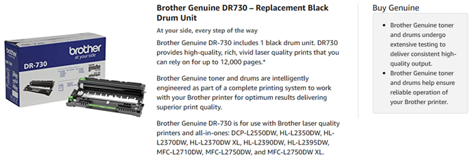 Business professionals who have invested money in high-quality Brother products expect the same from replacement supplies. The Brother Genuine DR-730 Black Drum Unit is a replacement drum for use with 9 different Brother printers and all-in-ones, intelligently engineered as part of a complete printing system. These genuine replacement Drum Units are produced with precision to deliver sharp, text and graphics with every page printed. The DR-730 drum unit yields approximately 12,000 pages(1) when used with Brother Genuine toner cartridges (sold separately).