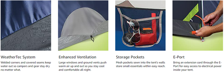 • Dome tent with a sturdy frame that withstands 35+ mph winds