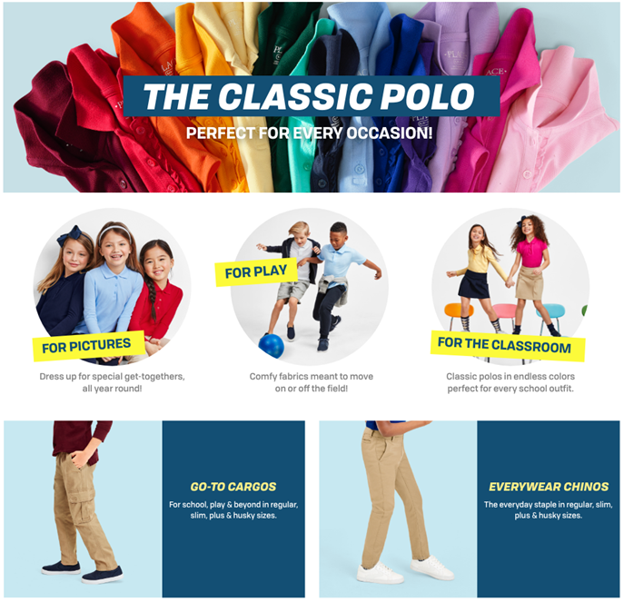 - The Children's Place offers value-priced clothes and apparel that are fun and easy to put together