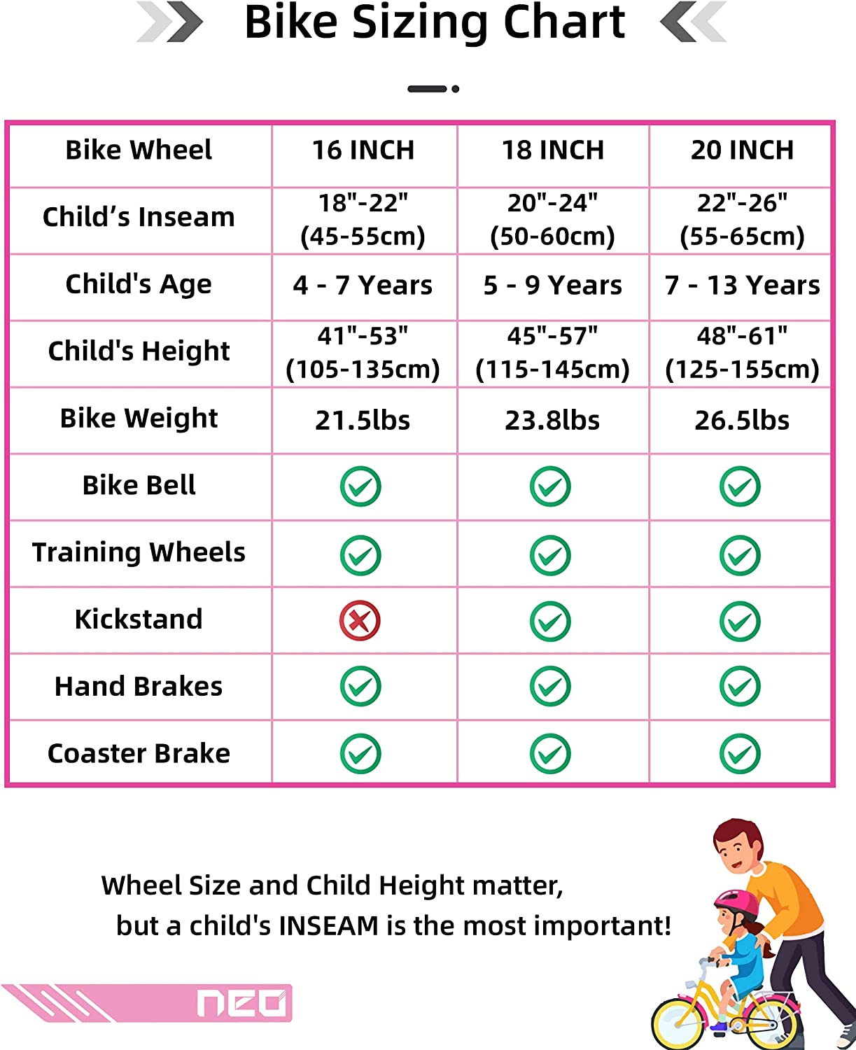 • Grow with Kids: The NEO Kid's Mountain Bike is great for first-time riders. Comes with detachable training wheels, a height-adjustable saddle, this kids bicycle can meet the needs of your child at different stages and grow with them. As your kids grow in confidence they can move to the next challenge.