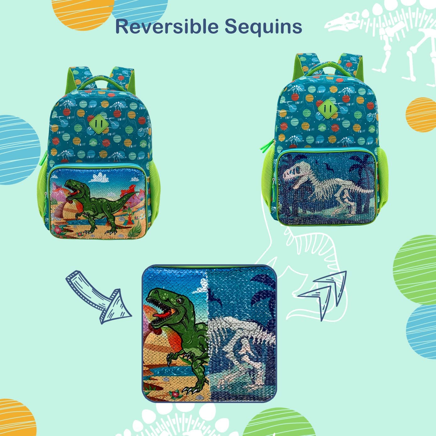 HAPPYSUNNY 16 Inch Dinosaur Backpack for Kids 5-7 Boys and Girls 3-5 Reversible Sequins Kids Backpack for Preschool Early Elementary Kindergarten Bookbags with Chest Strap