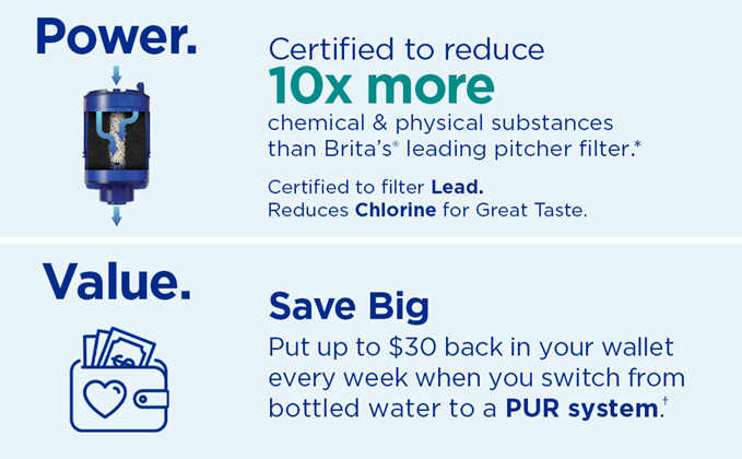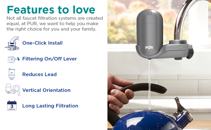 While home tap water may look clean, lead and other impurities can get into your water through leaching lead service lines. For cleaner, great-tasting water try a PUR PLUS Faucet Filtration System. PUR PLUS water filtration systems are certified to reduce 70 impurities, including lead, mercury. Plus, exclusive Mineral Core technology filters water over minerals for great taste. The design looks great in your kitchen and the Filter Change Light visibly indicates filter status, guaranteeing cleaner water straight from your faucet. With tool-free installation and a two-year warranty, there's never been an easier or more reliable way to get PUR water. PUR filter technology blends carbon and ion exchange materials for maximum impurities reduction. Ƚ PUR PLUS Faucet Filtration Systems are certified to reduce 10x more impurities than Brita's leading pitcher filter.*Ƚ Compatible water filter replacements are not certified to offer the same water quality – genuine PUR Filters are the only filters certified for use in PUR systems. Using a PUR water filtration system can reduce plastic waste and is more affordable than bottled water, helping you save up to $1,000 per year on average compared with the cost of bottled water***. Plus, each replacement water filter provides 100 gallons of filtered water, or up to 3 months of typical use.PUR is the #1 selling brand in faucet filtration.** PUR has been developing innovative technologies for superior water filtration for over 30 years. We believe life deserves PUR water. Disclaimers:ȽPUR does not filter microbes.*Versus best-selling Brita® pitcher filter OB03. Brita® is a trademark of Brita LP.**Based on Nielsen sales data for the 52 weeks ending 10/02/21.***Based on comparing a year's worth of bottled water (16.9 oz) to a PUR faucet filtration system and 3 refills. Based on Nielsen US Scantrack sales.
