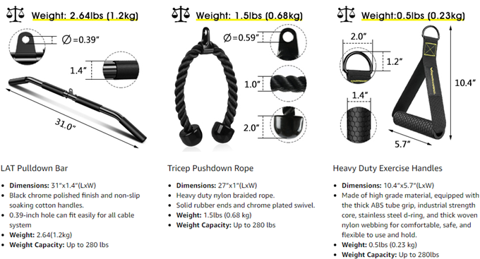 • ?【Three Deteachable Handles】We provide you with 3 detachable handles, allowing you to freely change the gym attachment you want; ① Tricep rope: used for triceps push down, Biceps flexion and multi-row movements. ②Honeycomb type handles: can exercise chest muscles by chest expansion and clamping, better non-slip to help you exercise more effectively. ③ LAT pull bar: used for pull-up/pull-down training, exercise arm wrist and forearm strength.