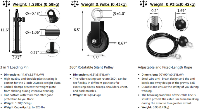 • ?【Professional & Premium Material】The upgraded loading pin is made of thicken steel, fitted with a 5cm widen detachable pipe sleeve to fit both Olympics and Standard weight plates, max weight loads up to 280 lb; the bottom increased sponge to ensure your floor from damage. 360° rota-table silent pulley, ensure quiet and stable of the pulley system operation; Comes with two sizes(70" & 90") high-level cable to meet your various exercise ways.