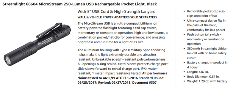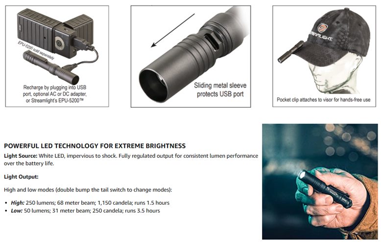 Included Components‎Flashlight, USB Cord, Lanyard, Pocket Clip, User Guide