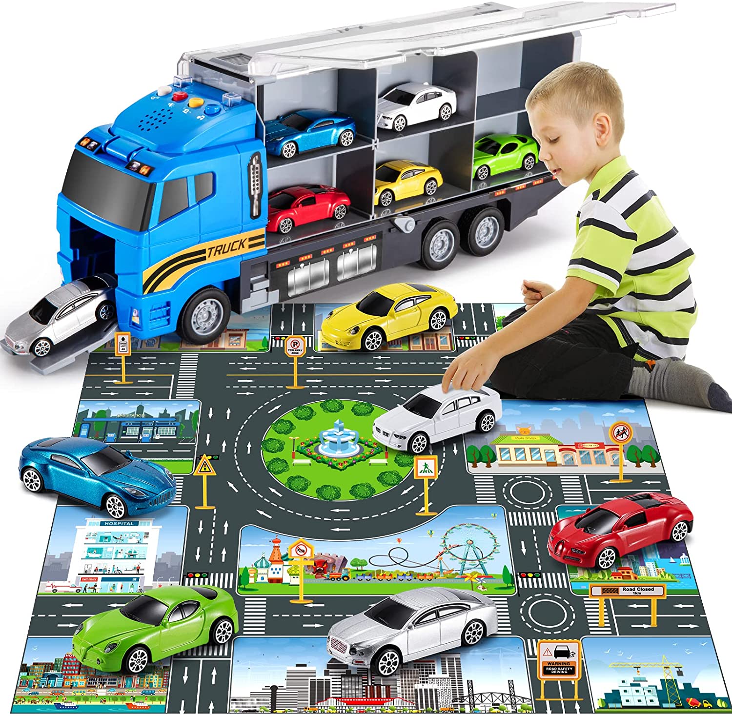• KIDS RACE CAR TOYS SET - Equipped with 1 x foldable play mat, 1 x multi-function transport cars, 6 x different colorful die cast race cars and a set of road signs. It is highly recommended for kids aged 3 and above to create endless happy times!