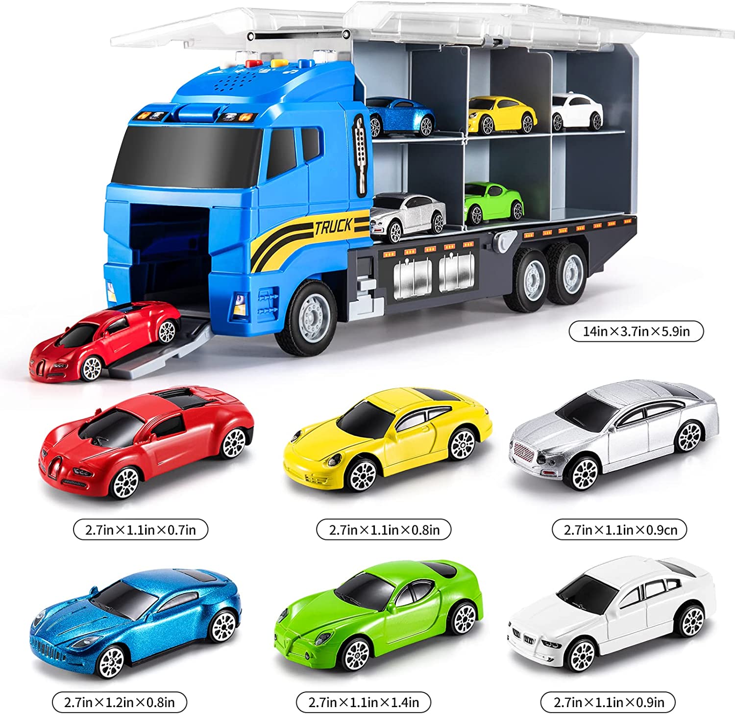 Our multifunctional racing-themed toy truck has the function of early childhood education. Very suitable for parent-child educational toys. Through 6 small cars of different colors and a large truck with storage function, guide children's daily storage habits, cultivate children's language ability, hand-eye coordination ability, imagination development, logical thinking, etc.