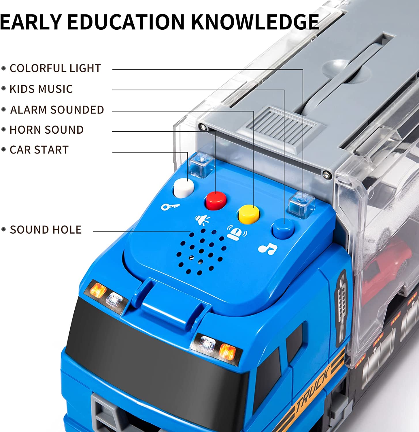 • ENRICH EARLY EDUCATION KNOWLEDGE - Our upgraded version of the race cars toy has a good early education function. Through the 4 buttons on the front of the truck, your child will see cool lights, hear the sound of the vehicle starting, the sound of the horn, the realistic police sound and the pleasant music. It is very suitable for parent-child education and cultivate children's imagination and creativity. There is a need for 2 AAA batteries (not included).