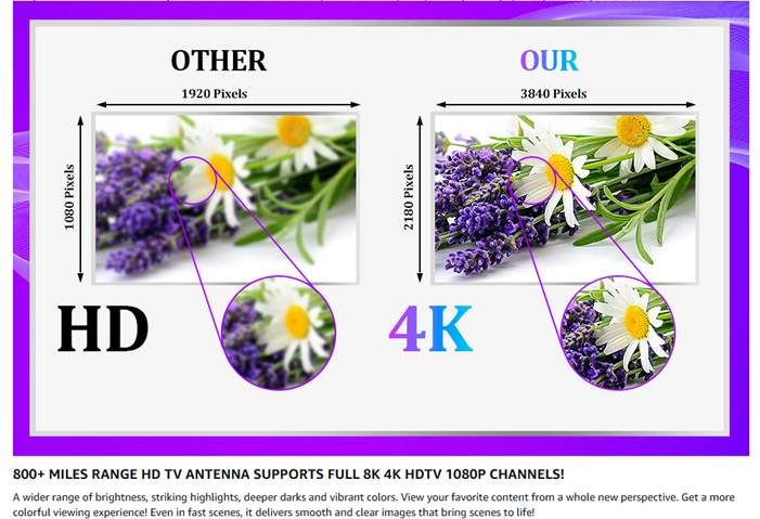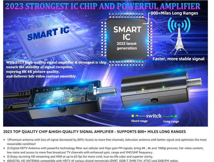 - ?▷【UPGRADED TO 800+ MILE LONG RANGE】- TV antenna for smart tv, equip with 2023 MOST POWERFUL built-in ic chip & HIGH-QUALITY signal amplifier, ensure the stability of signal reception,access to more free channels . Indoor/Outdoor tv antenna has high gain, bring clear pictures, low noise and access to most TV signals.Transfer 8k 4k combination of UHR and HDR video content. You deserved the 2023 Best & Oversized ANTENNA which offers more longer ranges on the market and lndustry-leading Power!