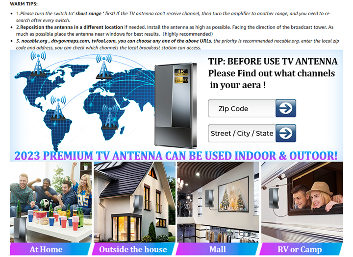 - ?▷【INDOOR/OUTDOOR ANTENNA FIT ANYWHERE 】- Easy install in Minutes. Give your home a modern decoration with this Unique and Fashional Design TV antenna. Three optional installation methods, including nail on the wall, sticks on the window or tie to shelf.Vertical or horizontal placement is allowed!You can place antennae in your home, underground garage , company, outdoor square for the best signal and the strongest reception. It also works as an outdoor antenna in RV or tent on your next trip!