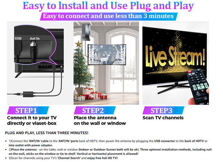 - ?▷【LIFETIME FOR FREE ALL LOCAL CHANNELS】- Say goodbye to the bill! BEYOND A PURCHASE! Enjoy hundreds of 0 COST channels with no pixelation, Brings scenes to life ! Digital HDTV Antenna start to access the news, sitcoms, kids and sports programs! TV antenna can receive channels including ABC,CBS, NBC,PBS,FOX, UNIVISION, CW, ION, UMAS ect . ❗Reminder: Re-scan channels after moving the antenna.