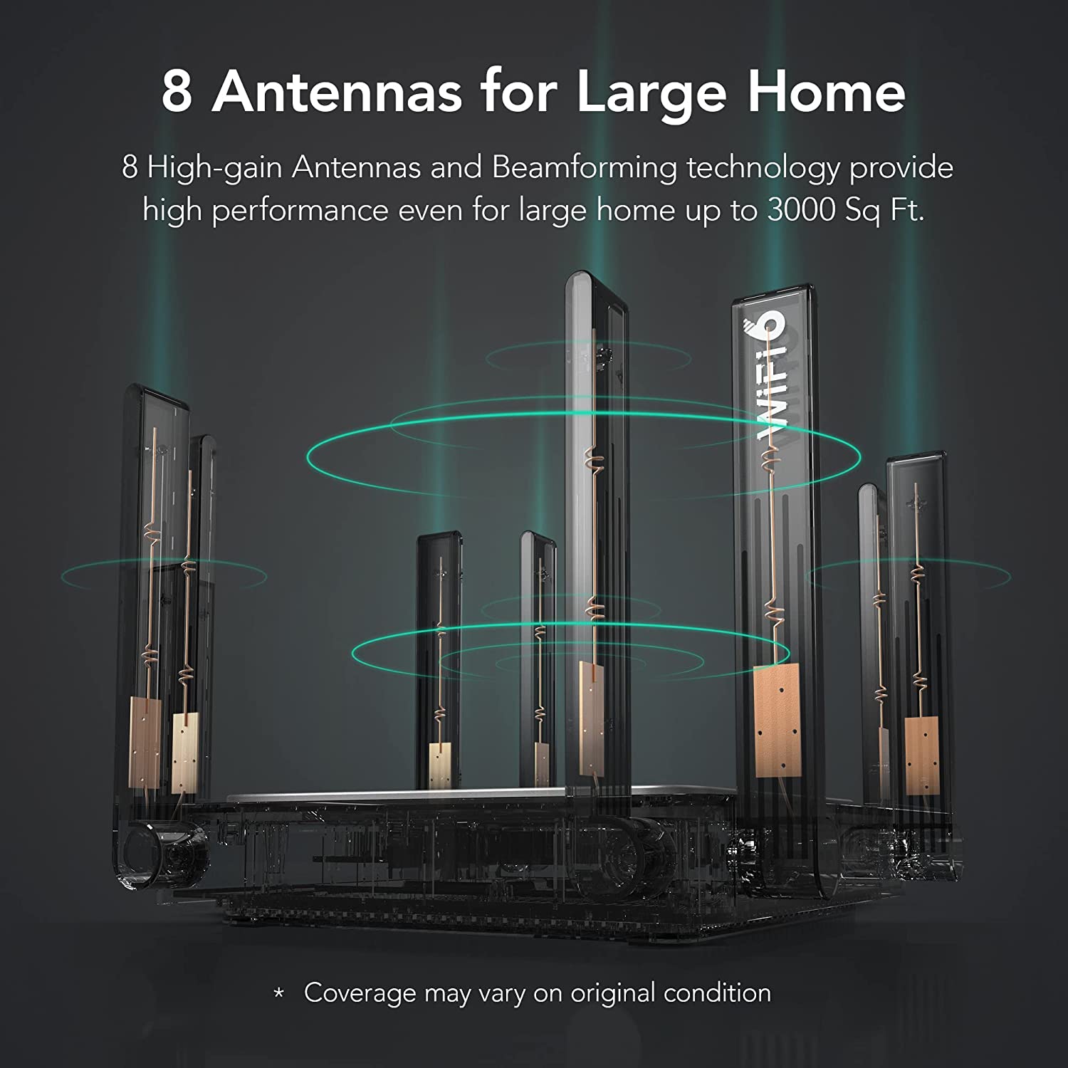 - Better Signal: This Wi-Fi 6 Wireless Router includes eight omnidirectional antennas with 4+4 high-power FEM amplifiers. The wireless signal coverage can reach up to 2000 square feet when combined with beamforming filtering. The signal is stronger when it passes through one more wall than four antennas, and diverse room kinds are not afraid.
