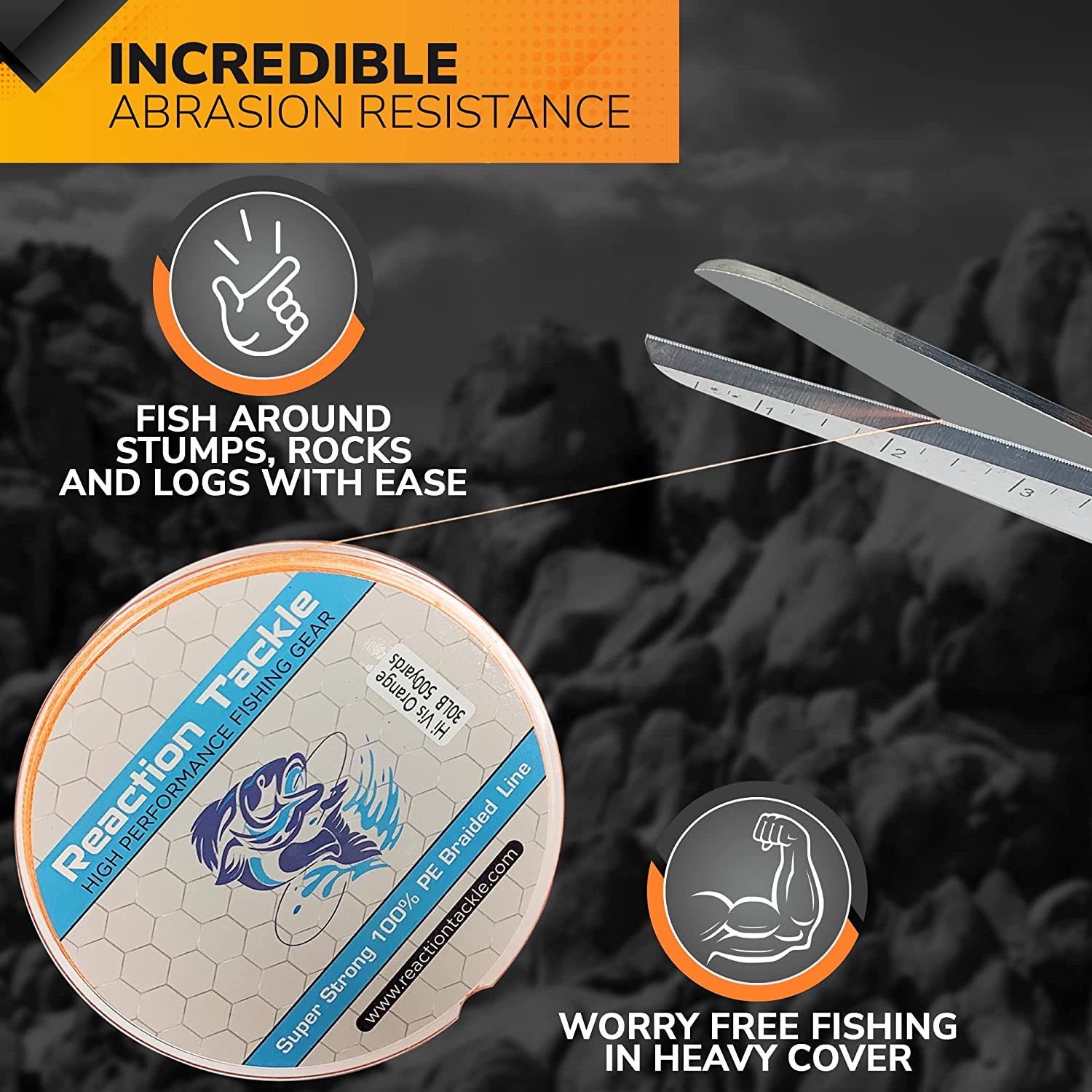 REACTION TACKLE HIGH QUALITY BRAIDED FISHING LINEReaction Tackle is located in Wisconsin. Everything is shipped from warehouses located in the USA.No need to overpay for brand name fishing line! Reaction Tackle high quality fishing braid is just as good as, if not better than, the most popular brands.Reaction Tackle 4 and 8 strand braided fishing line is made from UHMWPE, the world’s strongest fiber.We currently offer the most popular colored fishing braid such as: yellow, orange, blue, multicolor, green, camo, black, hi viz, neon, fluorescent, red, white, brown and more colors coming soon.Reaction Tackle braided line is coated for extra durability and flies through fishing guides to provide extra long casting distance. Our heavy lines can even be used for downrigger line at any depth. Braided line is a great alternative to monofilament or fluorocarbon lines use in your favorite ocean, stream river or lake.Customer satisfaction is our number one priority, give our products a chance. If you are not completely satisfied feel free to contact us and we will do whatever it takes to keep our customers happy.