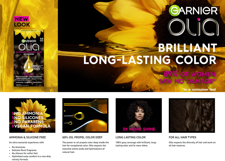 The oil powered technology propels colorants deep into the hair, without ammonia, giving you pure, vivid, long-lasting color. Olia visibly improves and restores hair as the oils help to reverse roughness and dullness for more brilliant, long-lasting color. Hair is hydrated, silky, and 3x shinier. How is Olia different? Unlike traditional hair color, Olia uses an exclusive 60% oil blend with natural flower oils to achieve brilliant, radiant color results. The unique non-drip velvet cream formula propels colorants into the hair--without ammonia--with a pleasant sensorial fragrance.