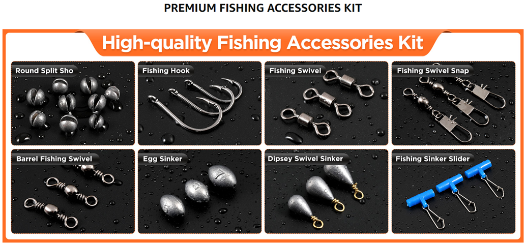 • 【Various Fishing Tackle Kit】- PLUSINNO 253pcs fishing gear gives beginner or expert anglers plenty of options to land a variety of fish. It collects nearly all accessories including Fishing Hooks, Round Split Shot, Egg Sinker, Dipsey Swivel Sinker, Fishing Float, Fishing Spinner Blade, Fishing Snap, 5 kinds of different Fishing Swivels, Fishing Sinker Slider, Fishing Beads, and Bobber Stops.The Fishing Hooks Especially suitable for smaller fish such as Perch, Bluegill, Crappie, and Walleye.