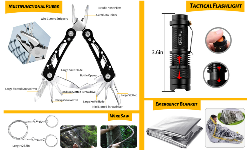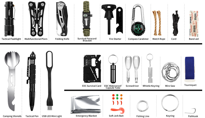 Included Components | Whistle, Knife, Water Bottle Clip, Wire Saw, Flint, Tactical Flashlight, Hooks, Flashlight, Waterproof Box, Compass |