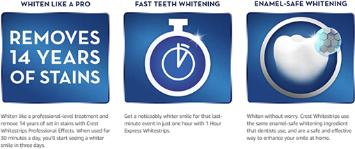 Want to your whiten teeth at home? Crest 3DWhitestrips Professional Effects Plus offering that features 20 Professional Effects treatments and 4 bonus 1 Hour Express treatment and is designed to whiten like a professional-level teeth whitening treatment at-home. The Advanced Seal Technology's comfortable, no-slip grip means the strips stay put until you take them off, allowing you to talk and even drink water while whitening your teeth. Made by the #1 dentist-recommended at-home teeth whitening brand, Crest 3DWhitestrips Professional Effects Plus will give you a 100% noticeably whiter smile, guaranteed. Using the same hydrogen peroxide whitening ingredient as dentists, this enamel safe at-home teeth whitening kit will make your teeth 23 levels whiter. Simply apply 20 treatments of Crest 3DWhitestrips Professional Effects Plus for 45 minutes a day and 4 treatments of 1 Hour Express for 60 minutes. This pack includes 48 teeth whitening strips, 24 for your top teeth and 24 for your bottom teeth, to be used over the course of 24 days.