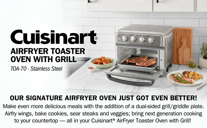 Cuisinart’s signature AirFryer just got even better! In addition to AirFrying french fries, baking cookies or warming up your leftovers, now you can make even more delicious meals in your Cuisinart® AirFryer Toaster Oven with Grill! Sear steaks and vegetables on one side and griddle the perfect breakfast on the other with the new dual-sided grill and griddle plate. Bring next-generation cooking to your countertop with the spacious 8-function oven that makes cooking a feast for family and friends — or a simple snack for one — fun, fast, and easy!