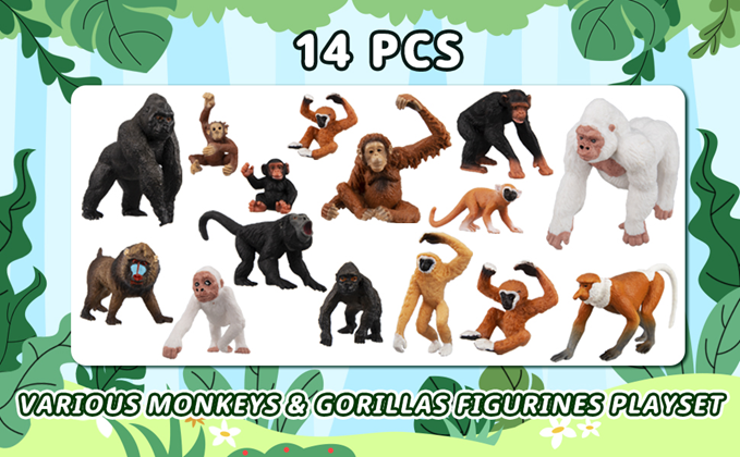 • ✔ FOREST MONKEYS BIG PARTY - TOYMANY 14PCS Wildlife Monkeys Figurines Playset includes 1 Mandrill, 1 Proboscis Monkey(Nasalis larvatus), 1 Squirrel Monkey, 1 Black Howler Monkey(Alouatta caraya), 1 Gibbon, 1 White-handed Gibbon, 2 Orangutans, 2 Gorillas, 2 Albino gorilla, 2 Chimpanzee /APE. Totally 14 pieces of jungle animal figurines.