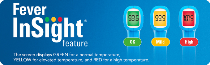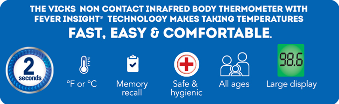 Introducing the new Vicks Non-Contact Infrared Body Thermometer. Recommended as a thermometer for adults, a baby thermometer and a thermometer for kids, this infrared thermometer is the perfect option for families. Designed to be fast, gentle, and easy to use, the non-invasive thermometer allows you to measure body temperature as well as food and bath temperature, in a quick 2 second reading, all with clinically proven accuracy. Simply aim the thermometer 0.4 to 2 inches away from the forehead, between and slightly above the eyebrows for an instant and accurate reading. The unique and proprietary Fever Insight feature changes the backlight on the large easy to read LED screen from green to yellow to red depending on the temperature reading to help you better understand the results. The non-contact feature is safer and more hygienic, helping reduce the transfer of germs. With a mute function for silent operation, the VNT275 allows you to take your child’s temperature without disturbing their sleep. Additional features include a memory recall that stores the last 50 readings and the ability to read in either Fahrenheit or Celsius. 2 AAA batteries included.