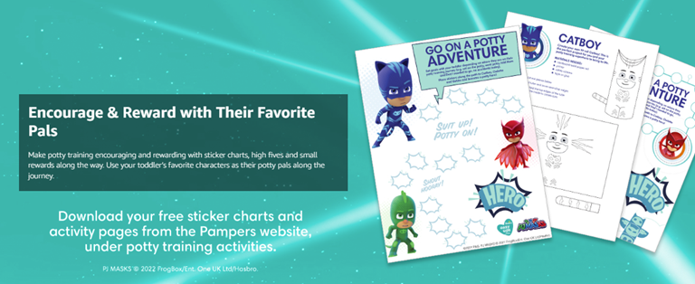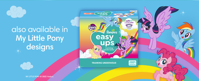 Potty-train like a hero with PJ Masks Pampers Easy Ups Training Pants. Featuring your favorite heroes Catboy, Owlette and Gekko, these super soft and comfy training pants fit just like real cotton undies with a 360 stretchy waistband that is gentle on your child’s skin and easy to pull up and down. Plus, they’re dermatologically tested, hypoallergenic, and free of parabens and latex.* That’s just one of the many reasons Pampers is the #1 pediatrician recommended brand. When it comes to potty accidents, your toddler will be covered with up to 100% leakproof protection. To protect where leaks happen most, Easy Ups are made with Dual Leak-Guard Barriers around the leg cuffs while Extra Absorb Channels quickly absorb accidents and lock them away from your toddler's skin. And when it's time to take them off, Easy-Tear Sides make removal and disposal a cinch. Potty-training is a journey and can take your toddler 90 days on average to catch on. So, Pampers Easy Ups makes it easy with each box containing a one-month supply of training pants. Available in sizes 2T–3T (16–34 lb), 3T–4T (30–40 lb), 4T–5T (37+ lb) and 5T– 6T (41+ lb).