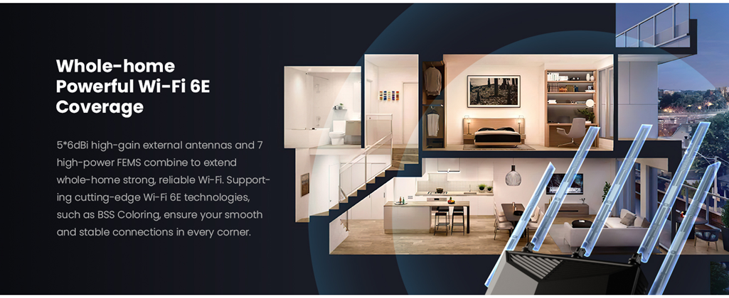 - Whole-home Powerful Wi-Fi 6E Coverage:5*6dBi high-gain external antennas and 7 high-power FEMS combine to extend whole-home strong, reliable Wi-Fi. Supporting cutting-edge Wi-Fi 6E technologies, such as BSS Coloring, ensure your smooth and stable connections in every corner.