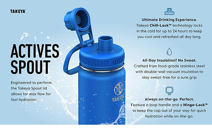 - Actives Insulated Water Bottle: Takeya Actives Stainless Steel Water Bottle is a sleek and rugged sports water bottle with a powder coated finish. The 40oz water bottle's unique double-wall vacuum insulation keeps drinks hot (12 hrs) and cold (24 hrs)