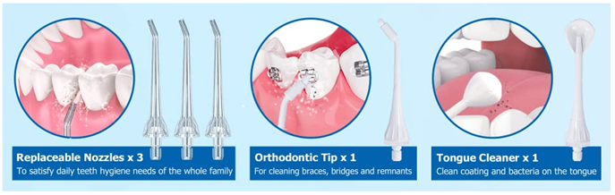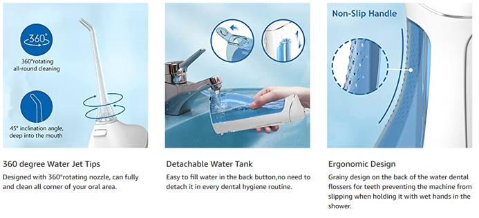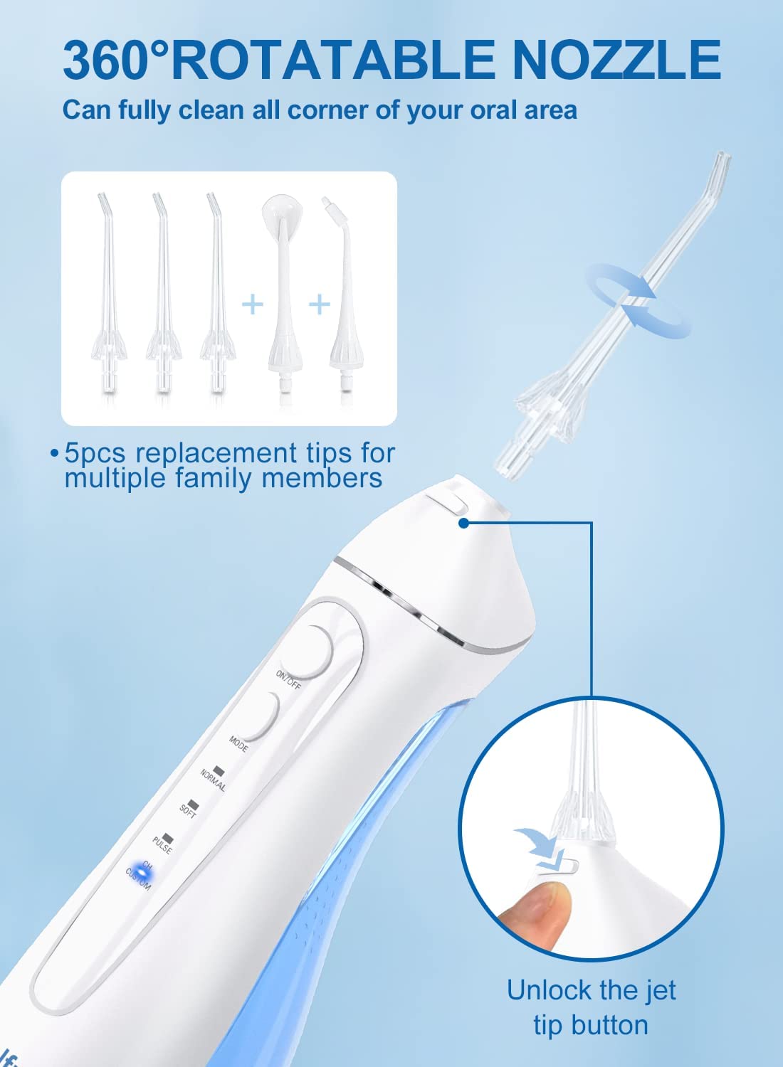 • PORTABLE DESIGN FOR TRAVEL: This water teeth cleaner picks with 5 replacement jet tips for multiple family members that can rotate 360 degrees during use, to fulfilled your variety needs from standard clean to gum massage, suitable home, office, business trips or traveling use on the go