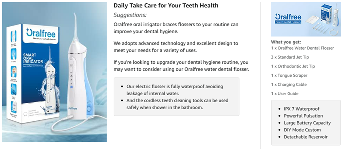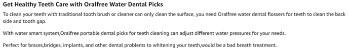 • ORALFREE ORAL IRRIGATOR PERFESSIONAL CUSTOMER SERVICE: 12 months after-sale service and friendly customer service. Oralfree is focus on helping customer to keep their mouth hygiene, guard their teeth health and Oralfree manufactured under strict quality standards to give our customers great experience, It's the great gift for friends