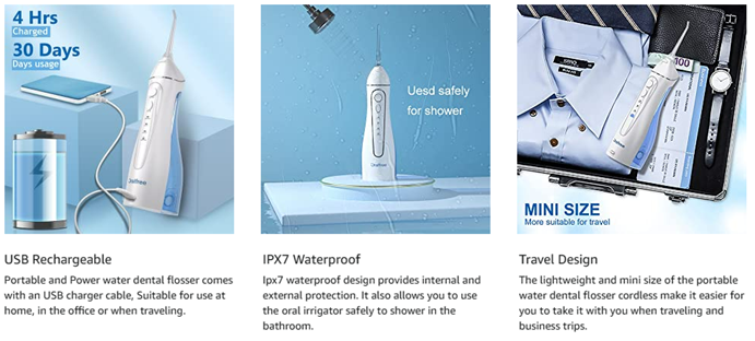 • POWERFUL BATTERY WITH USB CABLE AND IPX7 WATERPROOF: Water Dental Flosser Cordless for Teeth With powerful and environmental battery, fully charged need 4 hours and used continuously for about 30 days. Come with USB Cable, applicable to a variety of charging equipements such as power bank, computer, laptop... With double-sealing rings, oral irrigator braces flossers prevent water leakage reliably, allows the dental flosser braces cleaner to be used safely for shower in bathroom
