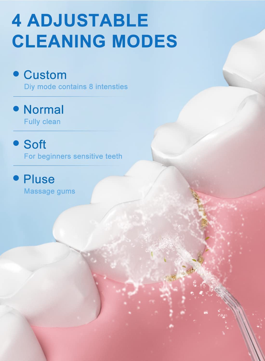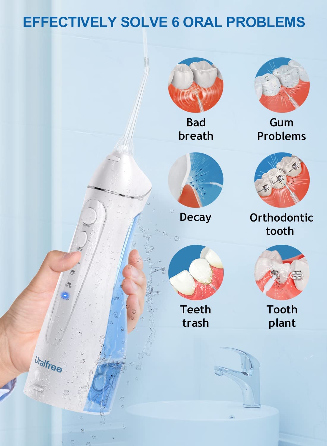 • 4 FLOSSING MODES POWER DENTAL FLOSSERS: Oralfree launch the newest portable water dental pick teeth cleaner items that was upgrade to 4 modes with Low-noise Design setting of water pressure to fulfilled your daily life use.Each mode provides you variety of using choice from standard mode, Please choose soft mode when you use dental flosser at the first time. Also helpful for bad breath, benefitful for bridge care