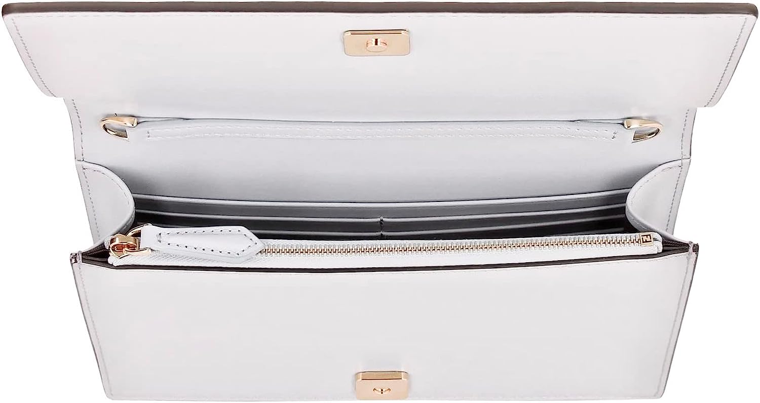• The Fendi Roma Ghiaia Wallet on Chain is beautiful and luxurious. The off-white soft leather is enhanced by the bold Fendi logo across the front. Carry by hand or over the shoulder by a delicate gold chain. Flap opening reveals a main compartment with credit card slots and a zippered pouch. Items stay secure with a snap closure. A beautiful white handbag perfect for everyday, weddings, an evening out and more. This timeless piece will bring joy for years to come.