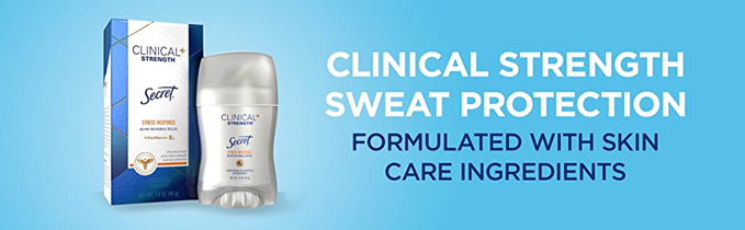 Never let them see you sweat! Secret Clinical Strength Antiperspirant and Deodorant for Women is clinically proven protection for 3 types of sweat; 1) stress sweat, 2) heat sweat and 3) activity sweat. It goes on dry and stays dry with 8x sweat activated odor fighters vs Secret Original Invisible Solid. Secret Clinical Strength Antiperspirant and Deodorant for Women Invisible Solid—incredible protection, no matter what the day may bring. Also available in soft solid and clear gel.