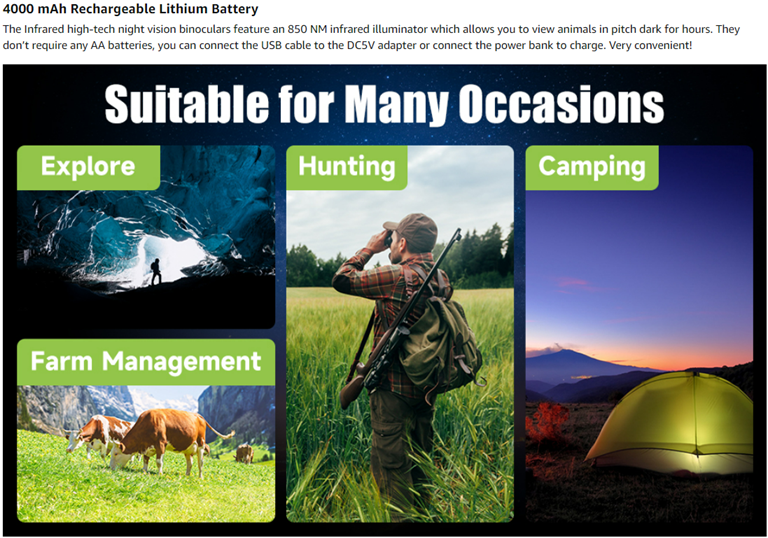 • Rechargeable Lithium Battery: Built-in a Li-ion rechargeable cell of 4000mAh. The Infrared high-tech night vision binoculars feature an 850 NM infrared illuminator which allows you to view animals in pitch dark for hours. They don’t require any AA batteries. Save money & the environment.