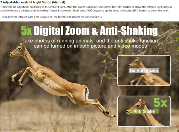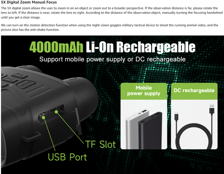 • Full High 4K Video & 36MP Picture: The night vision binoculars achieves 4K Full HD video resolution and 36 million pixels photos. The motion detection function can be turned on when shooting videos of running animals, and the pictures also have an anti-shake function.