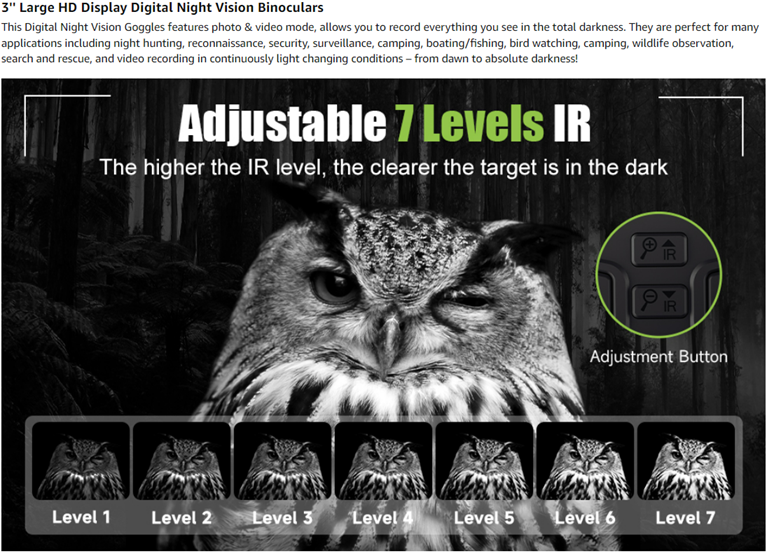 • Clearly See in Darkness: The night vision binoculars feature an 7 levels adjustable 850nm IR illuminator and All-Optical System allows you to see animals or plants clearly in darkness or dim ambient light. With 3 modes: taking photos, recording a video, and playback, you can capture high definition photos & videos with its outstanding optical clarity in the daytime, low light, or night time.