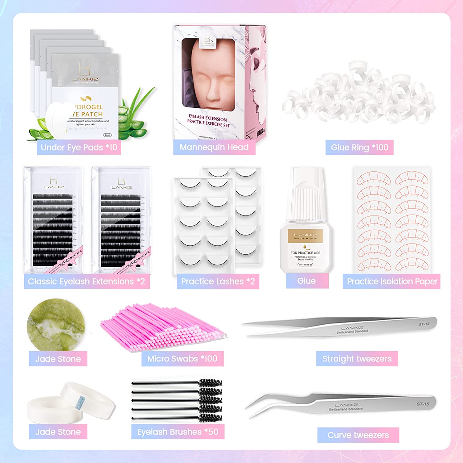 LANKIZ Eyelash Extension Kit, 21PCs Lash Practice Kit, Lash Kit for Eyelash Extensions Beginners, Eyelash Extension Supplies with Lash Mannequin Head for Training Makeup Practice