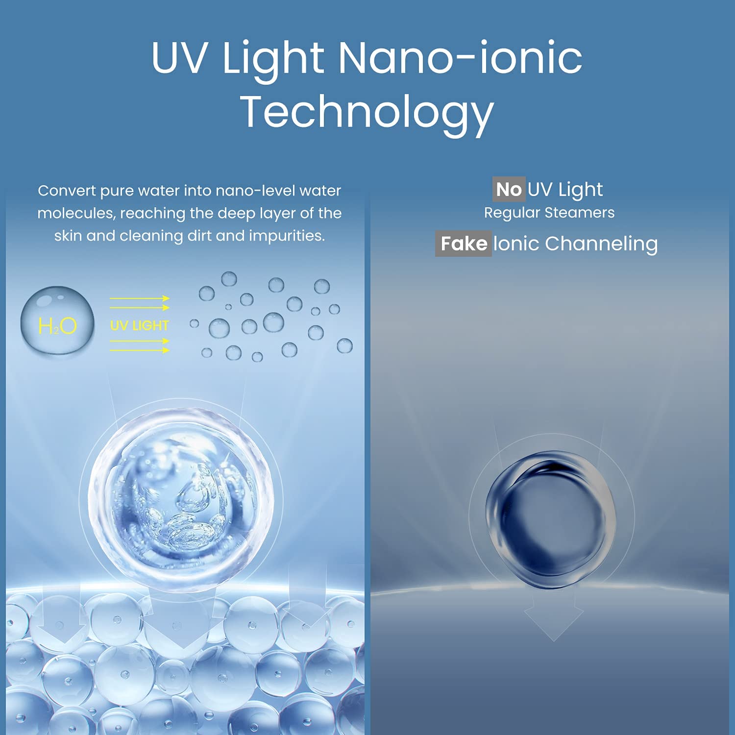 - Nano-Ionic Steam Purify Light --- A new nano-ionic facial steamer is equipped with a purify light inside, which can convert 100% pure water into nano-sized water molecules, reach your skin with purest and most effective condition. Help you clean the dirt and impurities of your skin