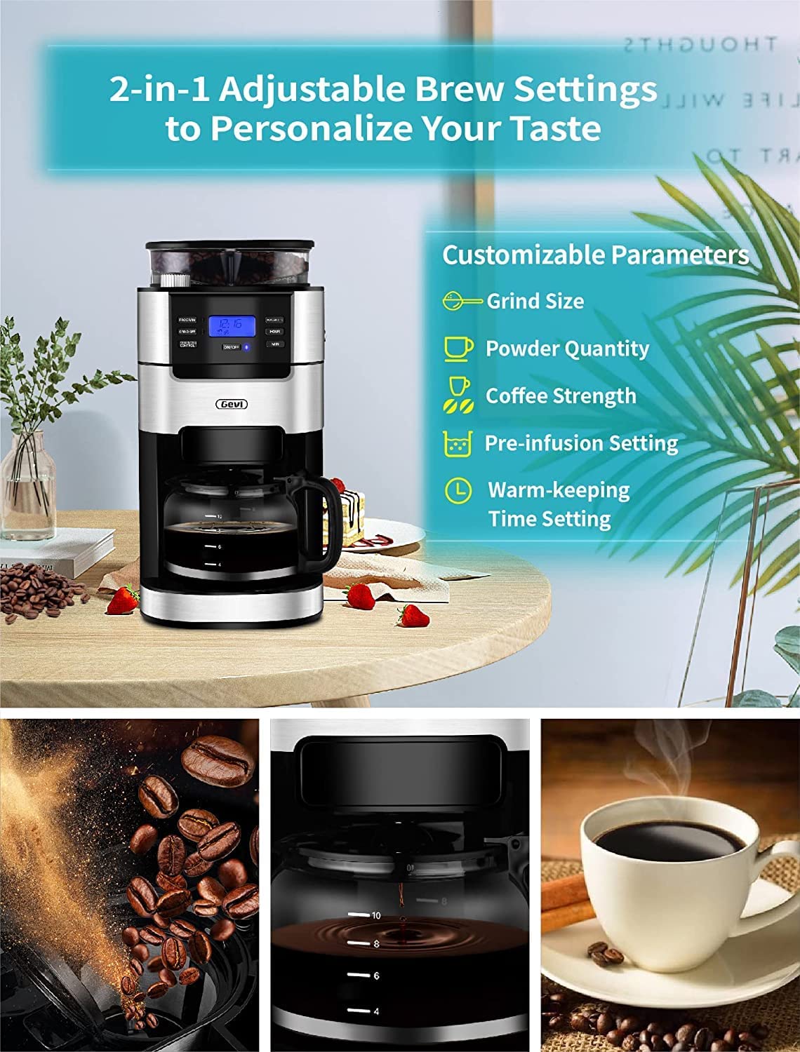- ☕ 【EASY TO OPERATE】: Depending on your personal preference, choose coffee beans or coffee powder to make drip coffee. The coffee machine is equipped with a burr grinder, so you can brew a cup of fresh coffee with coffee beans. The coffee beans are gathered and ground by the burr grinder, retain the full flavor of the beans, then the coffee powder will fall directly on the filter.